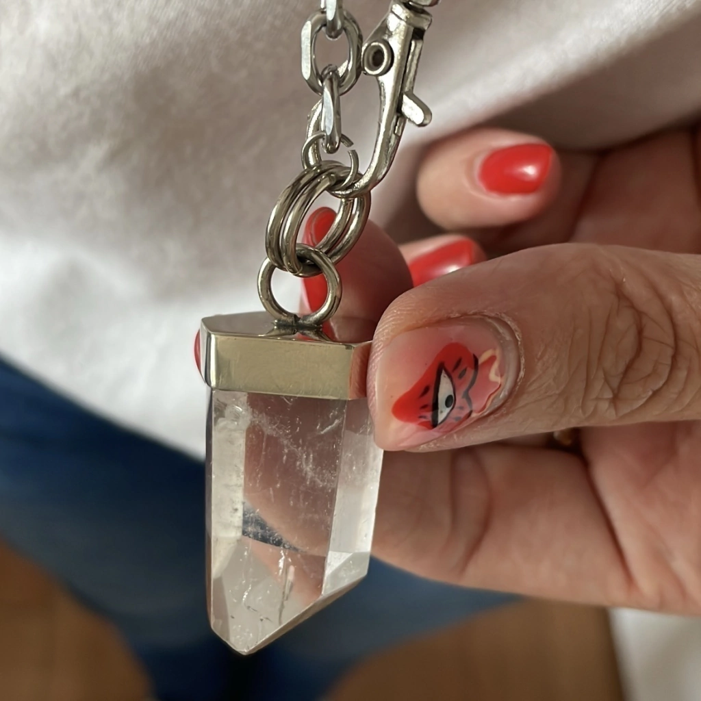 Collar con punta de cuarzo cristal engarzada artesanalmente en alpaca con cadena de acero quirúrgico de 80 cm con cierre mosquetón delantero para poder usarlo largo o corto doble.