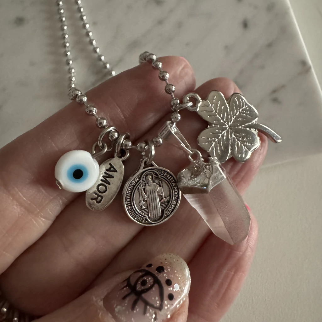 Collar con dijes protectores Como el trébol de cuatro hojas, piedra de punta de cuarzo cristal, dije San Benito, dije amor y ojito protector de vidrio.