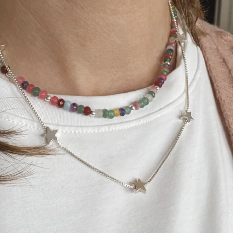 Gargantilla en colores de diferentes piedras naturales con terminaciones y bolitas de plata 925