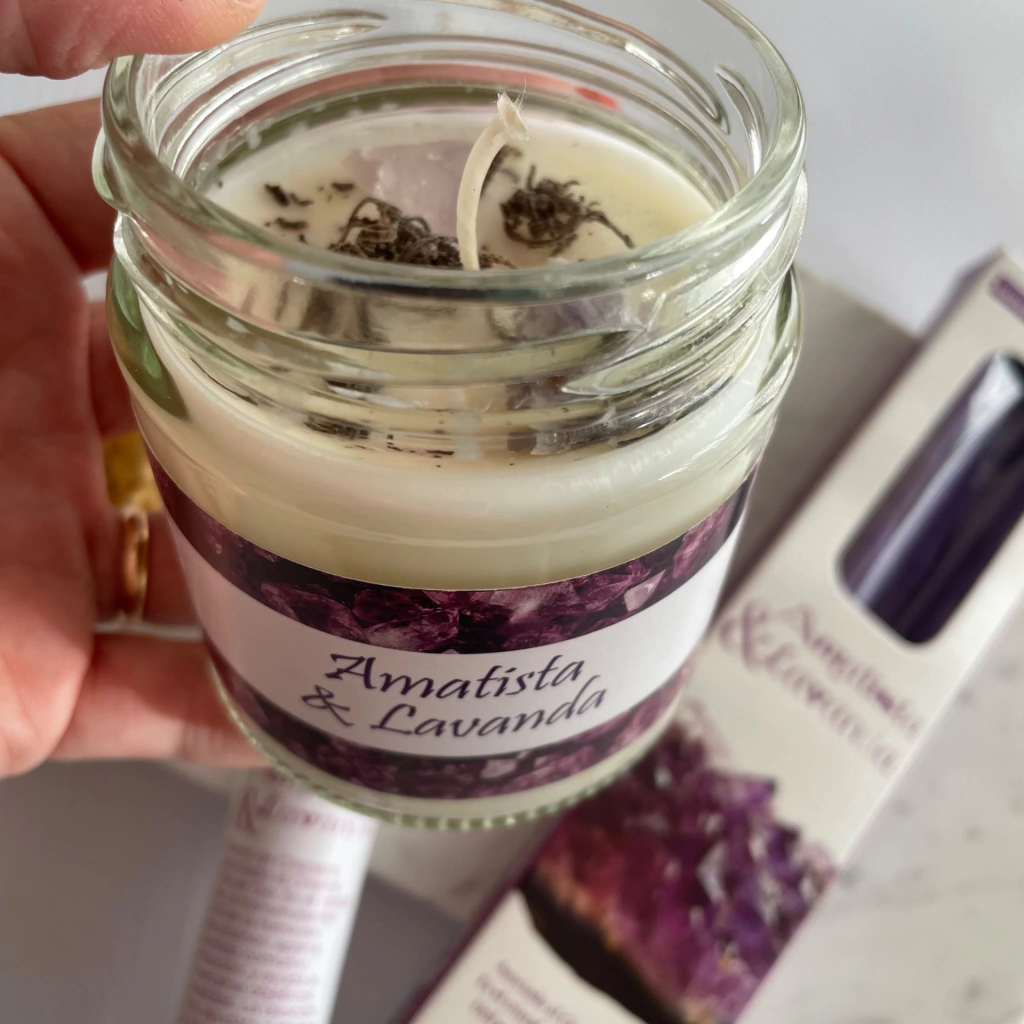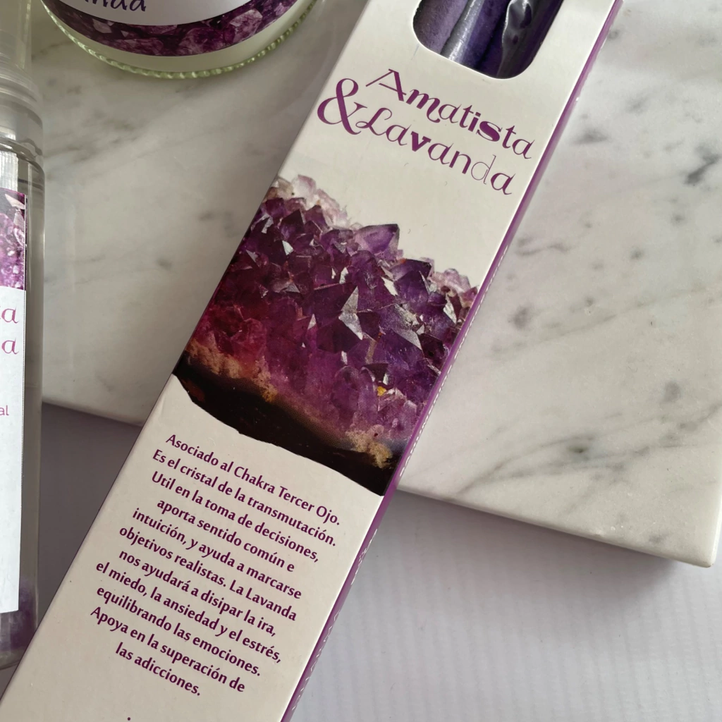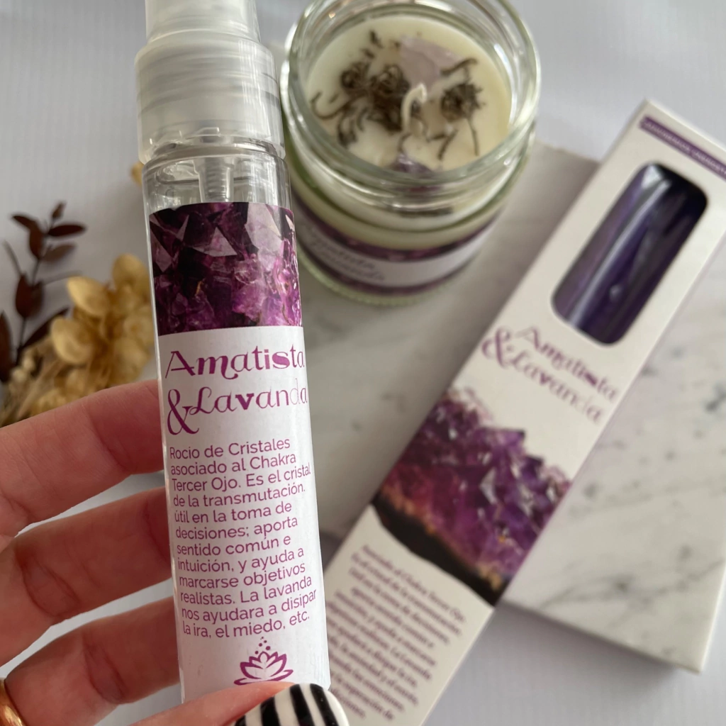 Amatista & Lavanda: La amatista es el cristal de la transmutación. Útil en la forma de decisiones, aporta sentido común intuición y ayuda a marcarse objetivos realistas.