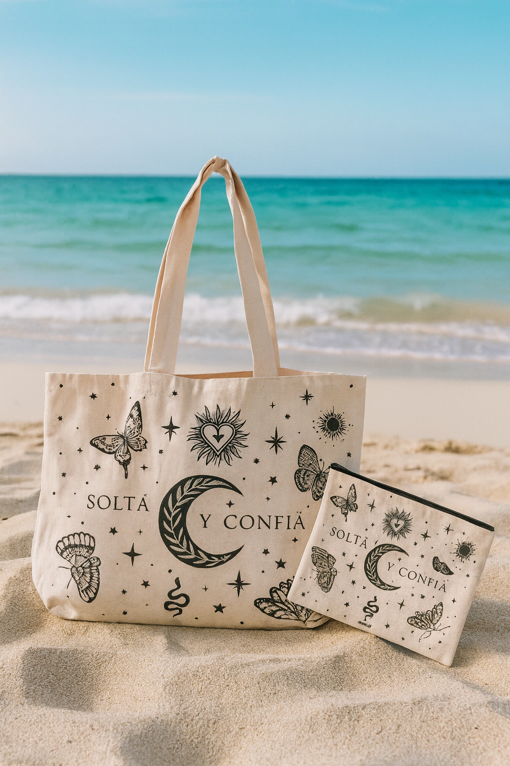 Descubrí el Mega bolso con neceser Solta y Confia, el aliado perfecto para acompañarte con estilo y energía positiva en cada momento.