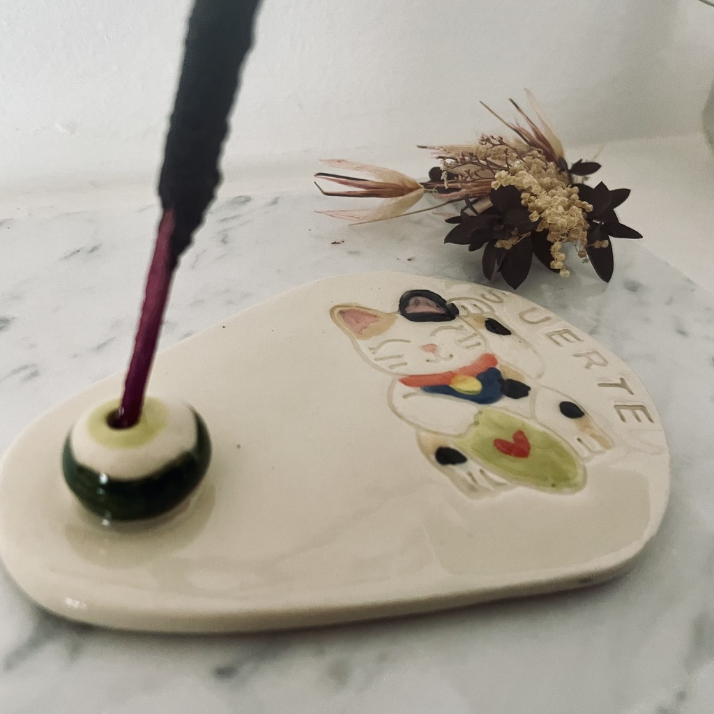 Porta sahumerio de cerámica artesanal con Gatito pintado a mano con la palabra "suerte"