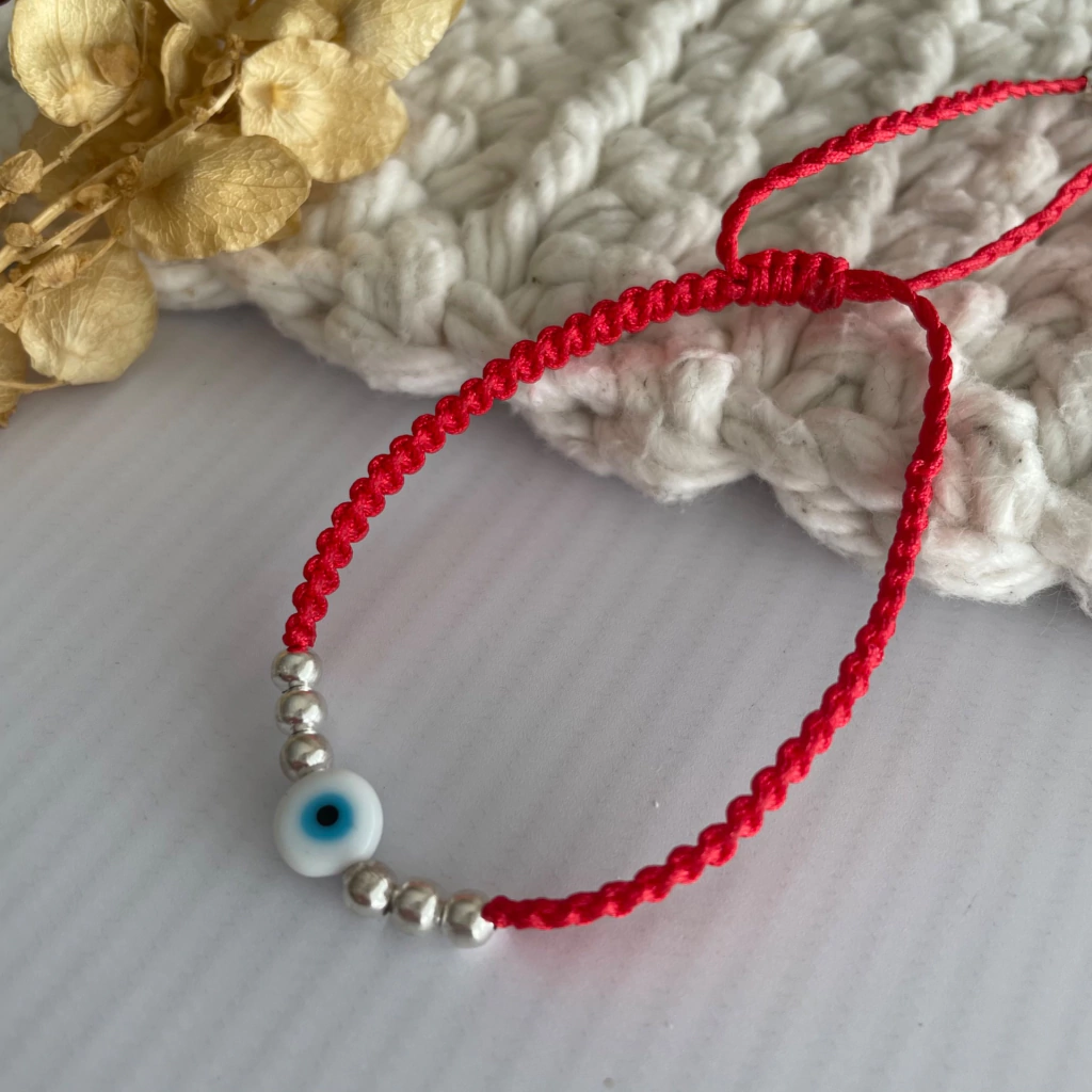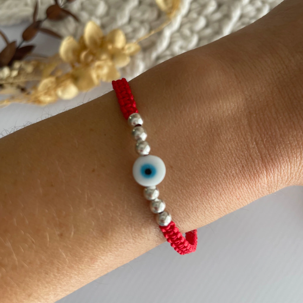 Pulsera roja regulable de hilo chino con bolitas de acero quirúrgico blanco y ojito protector blanco