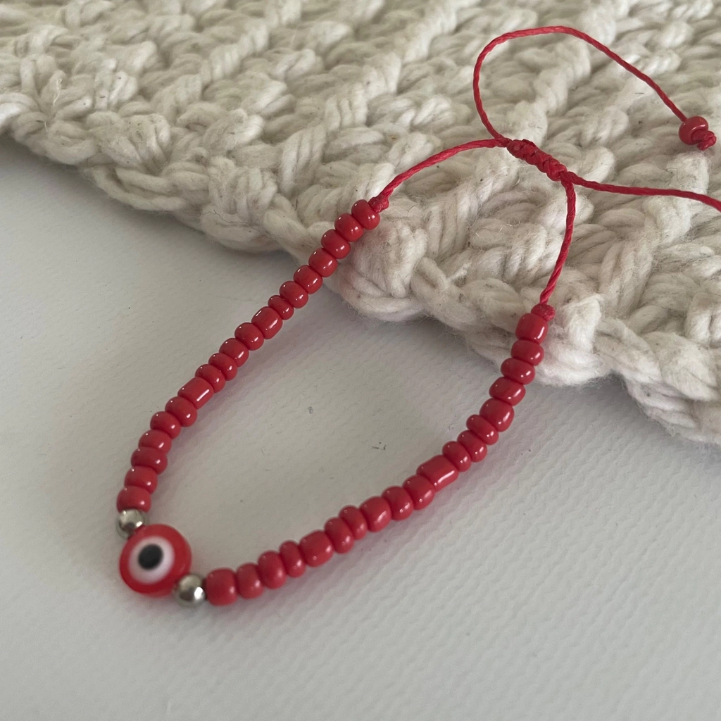 Pulsera en hilo encerado de acero quirúrgico rojo regulable con mostacillas y ojito